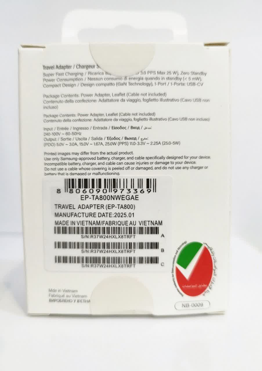آداپتور شارژر 25 وات سامسونگ اورجینال مدل EP-TA800 ( یکسال گارانتی تعویض)