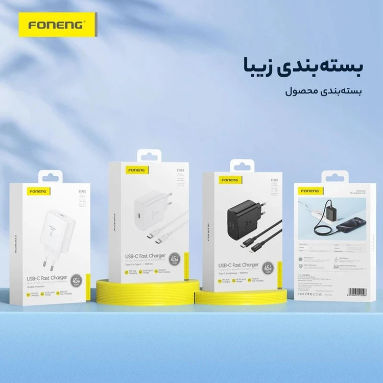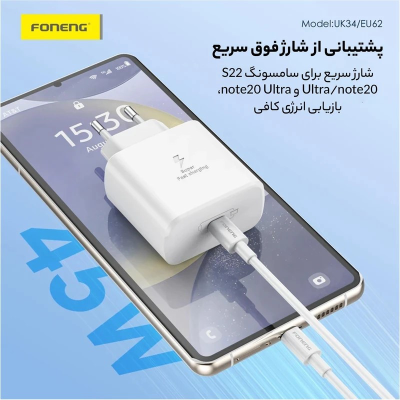 شارژر دیواری 45 وات سوپرفست شارژ فوننگ. نه تنها سریعترین دستگاههای سامسونگ را به سرعت شارژدهی میکند، بلکه با مدلهای دیگر هم سازگاری خوبی دارد. شارژها از مهم ترین عوامل طولانیتر شدن عمر گوشی و باتری هستند، به طوری که اگر از شارژر مناسب و مرغوب برای گوشی خود استفاده نکنید میتواند آسیبهای جدی به گوشی شما وارد کند. اگر به دنبال یک شارژر دیواری قدرتمند و سریع برای شارژ کردن دستگاهتان میگردید، ما به شما خرید شارژر 45 واتی فوننگ را پیشنهاد میدهیم. برای دستگاههای سازگار با استاندارد PD 3.0 حداکثر شارژ 45 وات دریافت خواهید کرد، و درگاه ارتباطی آن از نوع USB Type-C است. لازم به ذکر است این محصول بدون کابل است و باید به صورت جداگانه کابل مناسب را تهیه کنید.