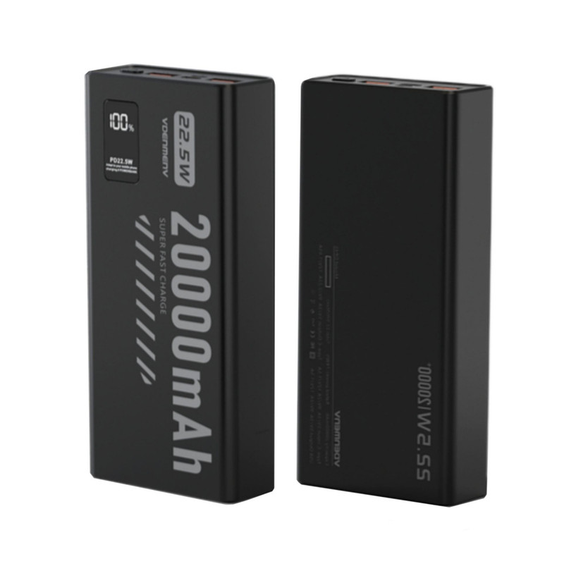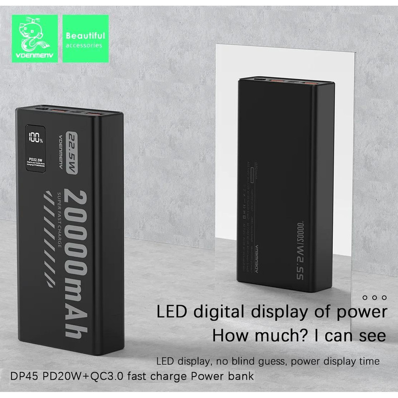 پاوربانک اورجینال V DENMEN V DP45 تولید شرکت وی دنمن از یک باتری لیتیومی با ظرفیت 20000 میلی آمپر ساعت بهره میبرد. با داشتن این پاوربانک دیگر بابت تمام شدن شارژ باتری گوشی موبایل، تبلت دوربین دیجیتال و لوازمی از این قبیل نگرانی نخواهید داشت؛ زیرا میتوانید در هر شرایطی بدون نیاز به پریز برق باتری گوشی موبایل یا دیگر لوازم سازگار با این محصول را تنها با استفاده از یک کابل USB شارژ کنید. در ساخت این دستگاه از تکنولوژی شارژ سریع Quick 3.0 Charge استفاده شده است. پشتیبانی از شارژ سریع به این معنی است که باتری دستگاه شما با کمک این پاوربانک سریعتر از شارژرهای معمولی شارژ خواهد شد. البته باید توجه داشته باشید که تکنولوژی شارژ سریع تنها با دستگاههای دارای استاندارد شارژ سریع و در دستگاههای معمولی امکان استفاده از این تکنولوژی وجود ندارد. با استفاده از نمایشگر LED تعبیه شده در این پاوربانک، شما میتوانید وضعیت شارژ باتری از طریق نمایشگر LED روی بدنه بررسی کنید. بدنه ی این پاوربانک از جنس پلاستیک است. توان کلی این دستگاه تا 22.5 وات میباشد و این دستگاه مجهز به فناوری PD نیز میباشد که قابلیت مناسبی برای کاربران گوشی های نسل جدید و آیفون میباشد.
